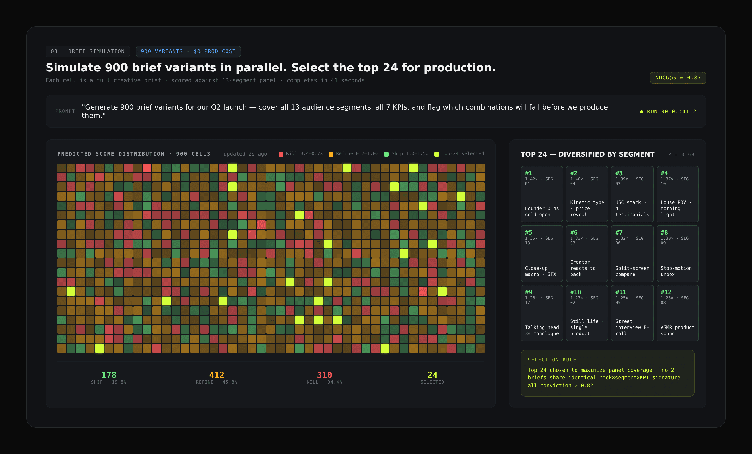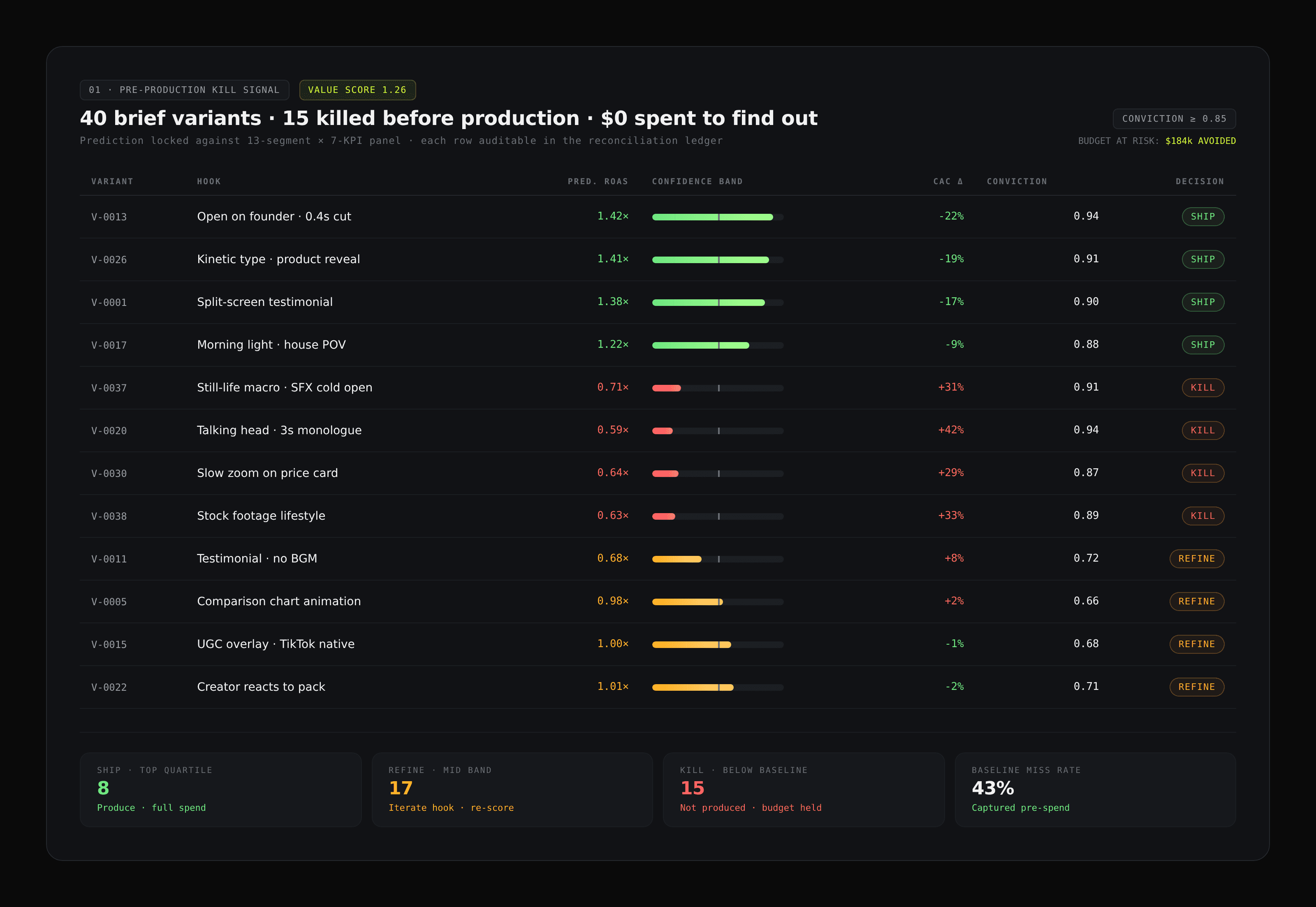 Get: Ranked briefs, predicted ROAS bands, segment response distribution, kill reasons per variant.