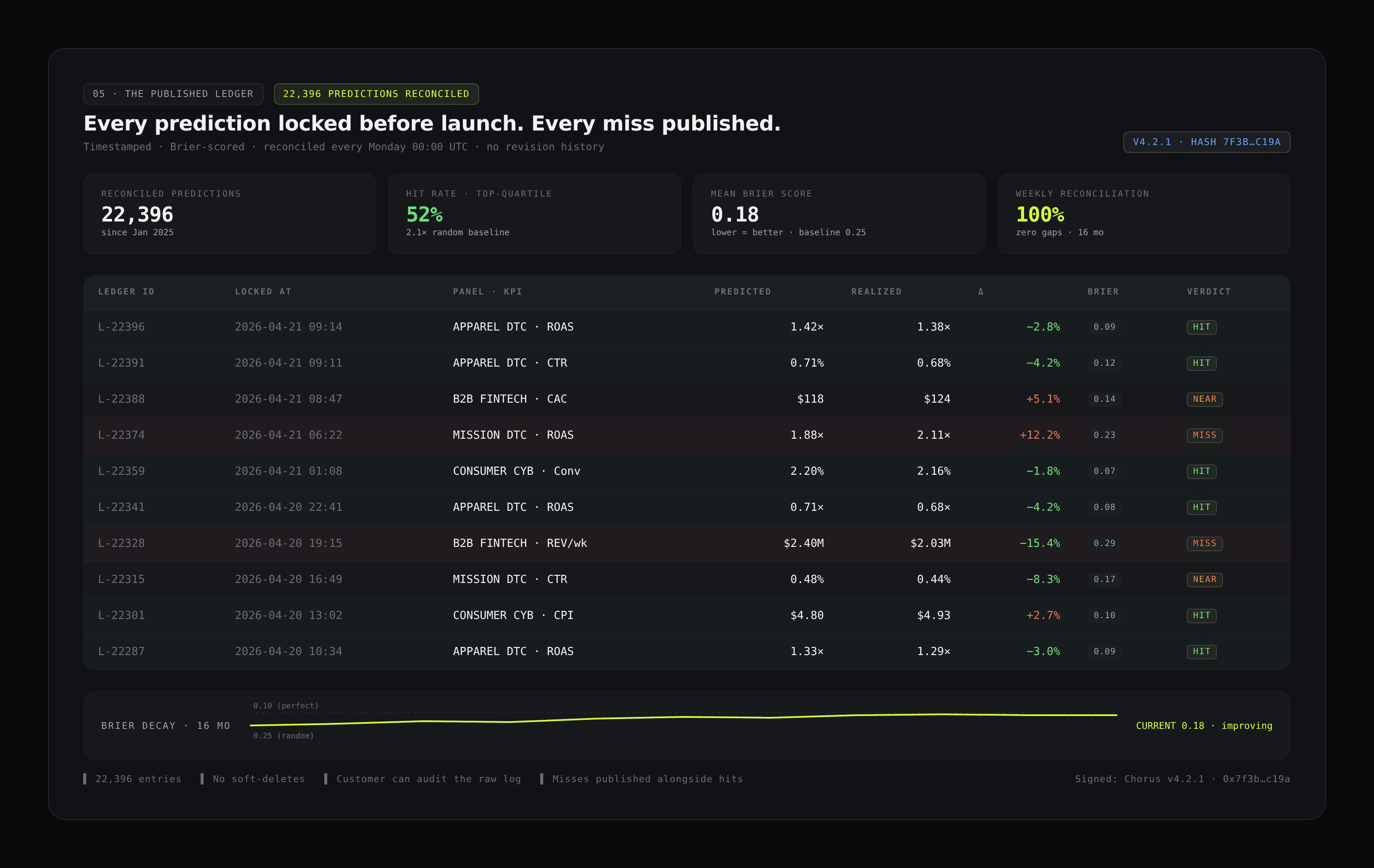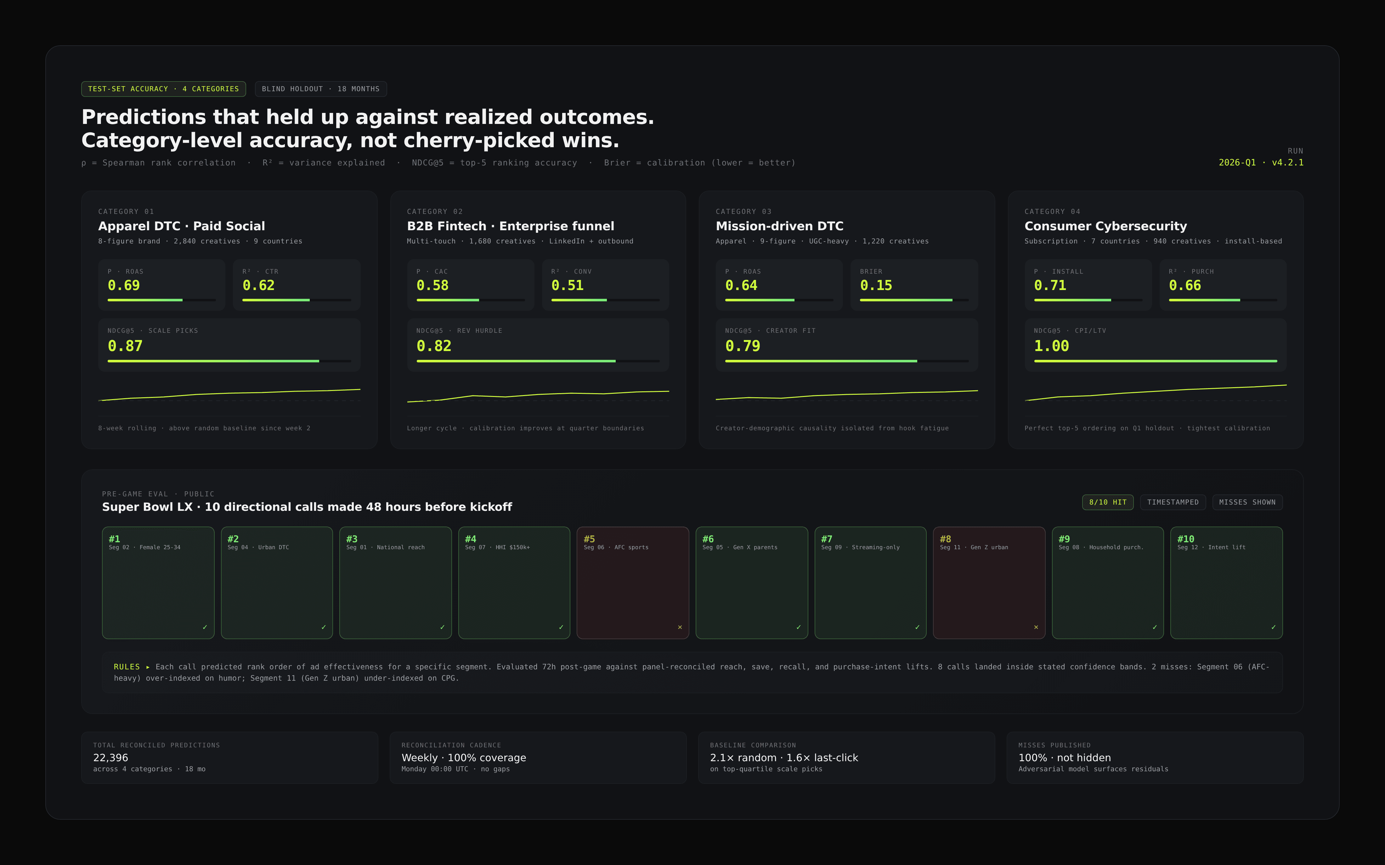 Held-out validation on production brand data across four categories. Timestamped predictions matched to realized outcomes. Misses published alongside hits.