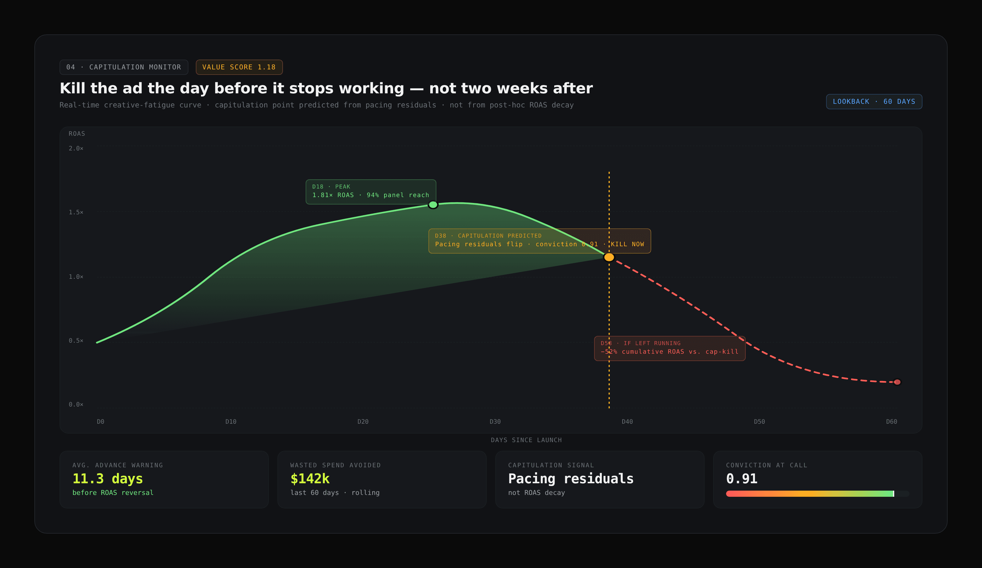 The percentage of your active paid creative currently suppressing your own ROAS — at creative-feature resolution. Most brands cannot answer this question. The prediction engine can, and flags the specific ads to kill today.