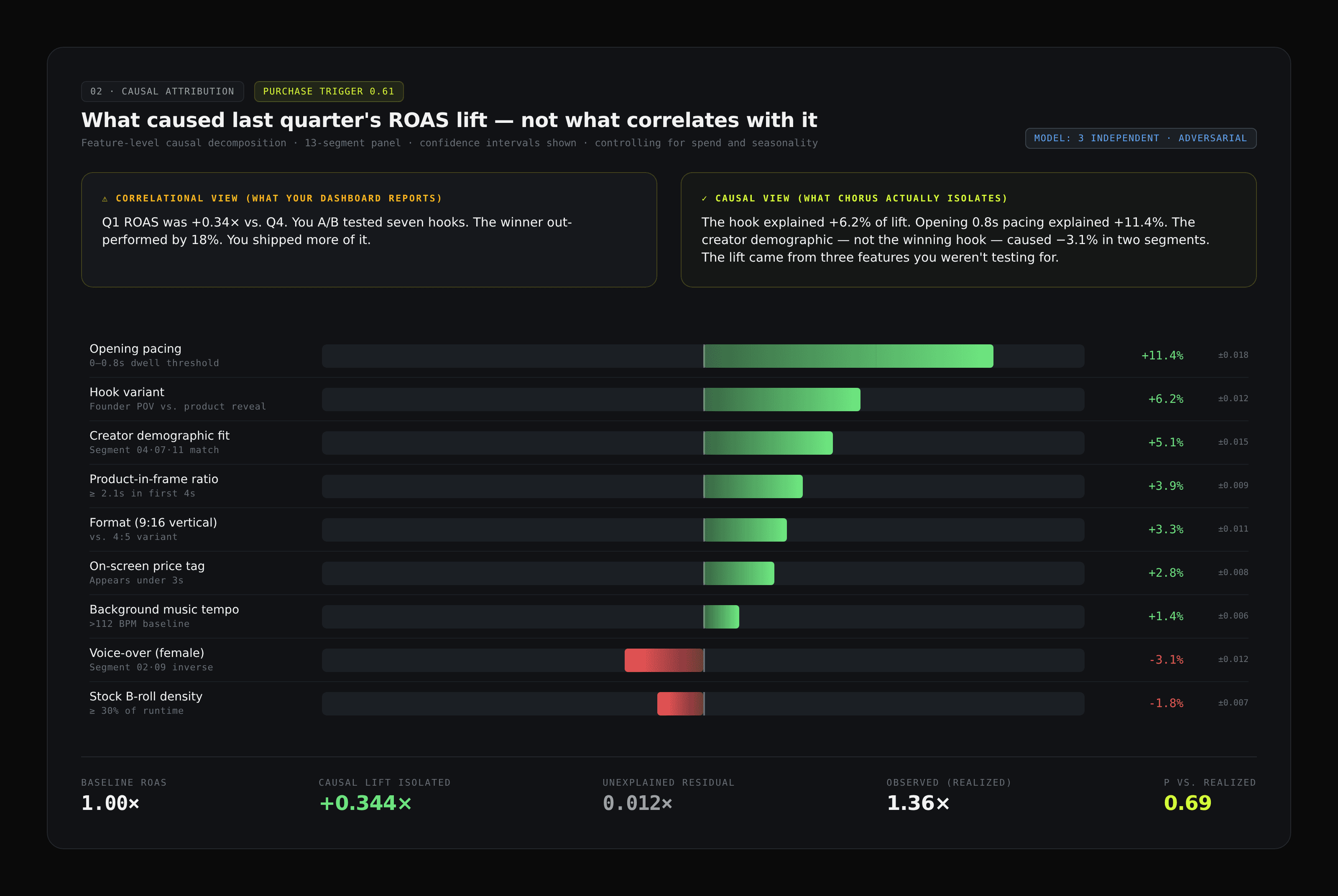 Per-feature Shapley attribution with confidence bands. The conversation with your CFO moves from "these ads ran and ROAS went up" to "this specific creative feature caused a traceable lift — controlling for spend, seasonality, and every other campaign running at the same time."