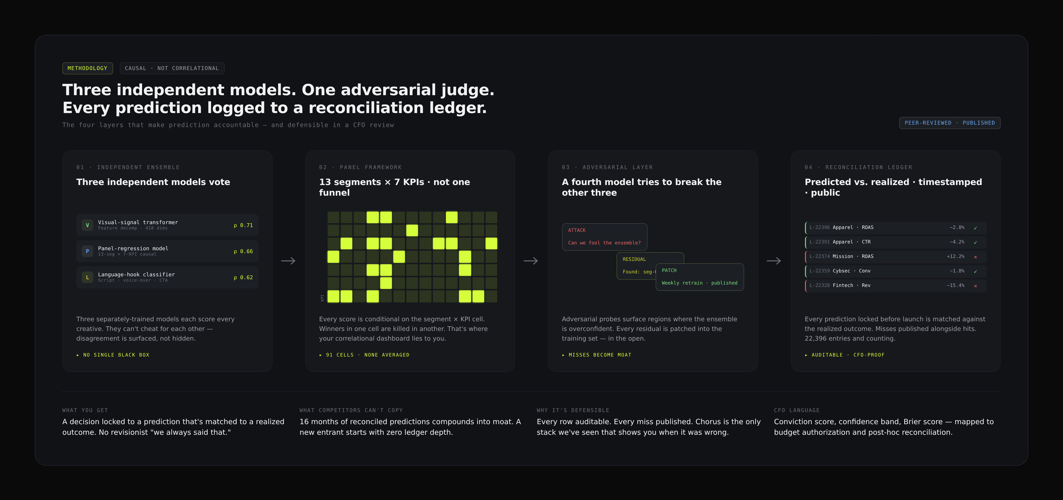 It isn't a black box. Every prediction ships with its top-seven Shapley drivers, the 95% confidence band, a similar-brief comparable set, and the historical hit rate on that specific creative family. The underlying models are published in our methodology paper — no proprietary magic, just disciplined ensembles, DoubleML confounding adjustment, and a reconciliation ledger you can audit line by line.