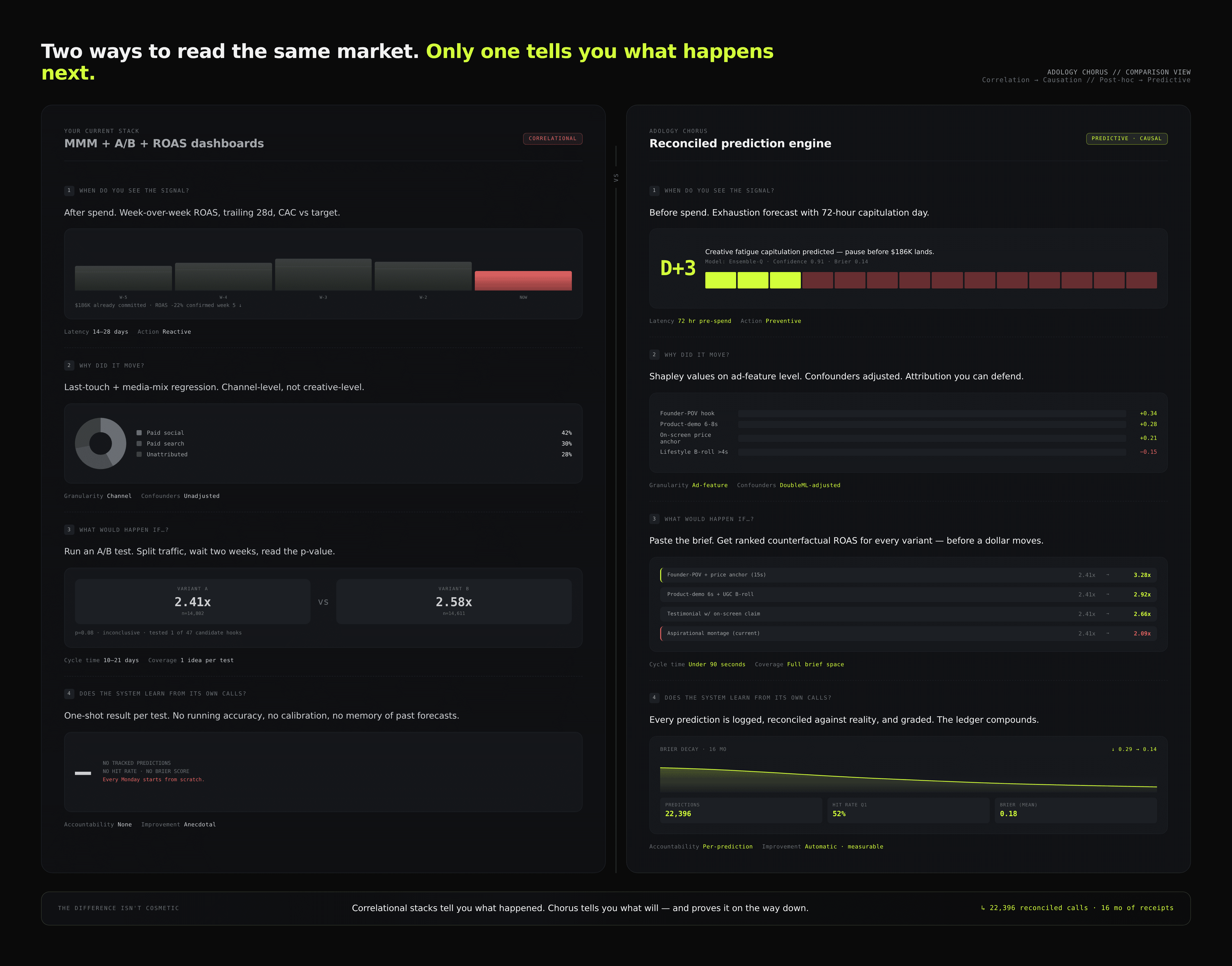 MMM, A/B tests, and ROAS dashboards explain what already happened. Chorus predicts what will — at the feature level, before the spend — and grades itself against every outcome.