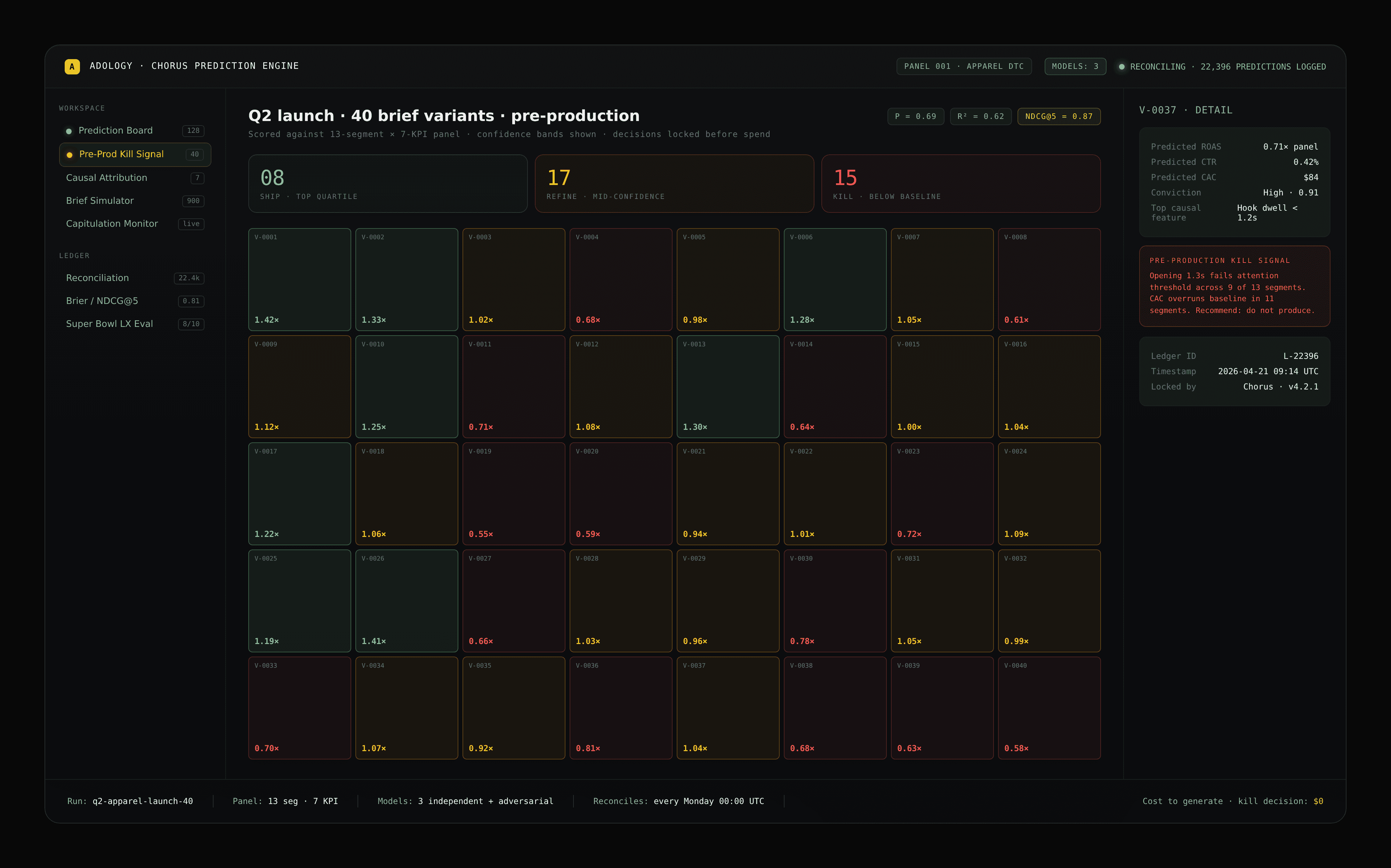 Pre-production kill signals. Per-feature causal attribution. A reconciliation ledger where every prediction is locked before launch — and every miss is published. Defensible, CFO-proof numbers, before you commit a dollar of production spend.