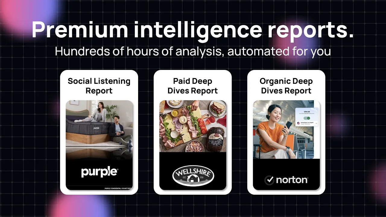 Marketers waste hours digging through ad libraries, screenshots, and forums. Our team does the analysis so you get insights, not raw data.