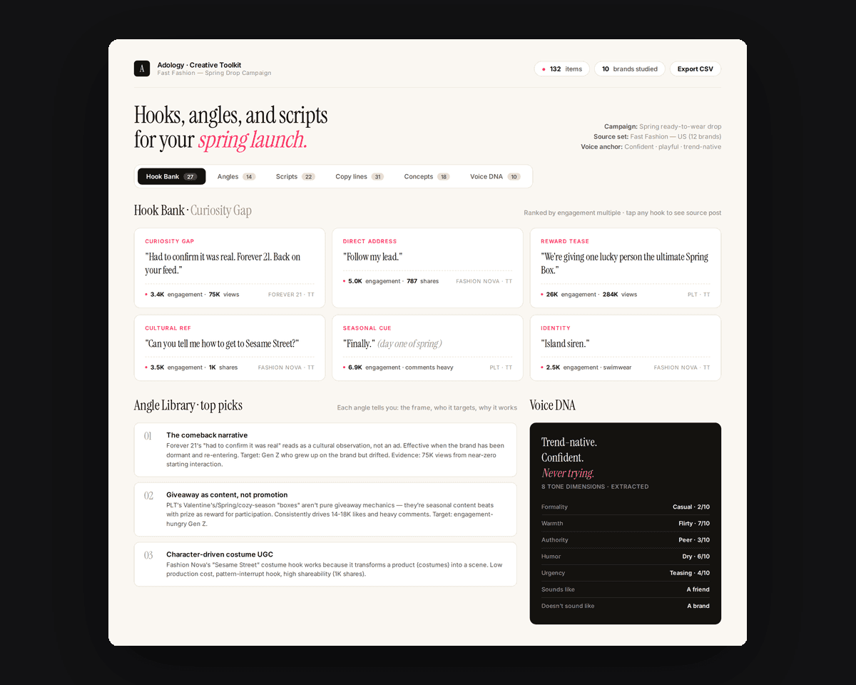 Hooks, angles, scripts, and concepts in your brand voice, pulled from what's actually performing in your category. Every item comes with data proof — so your creative team knows why it's worth testing.