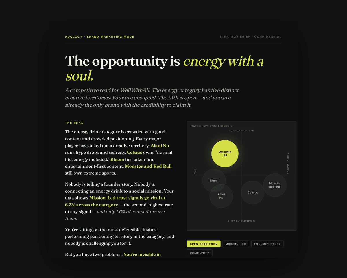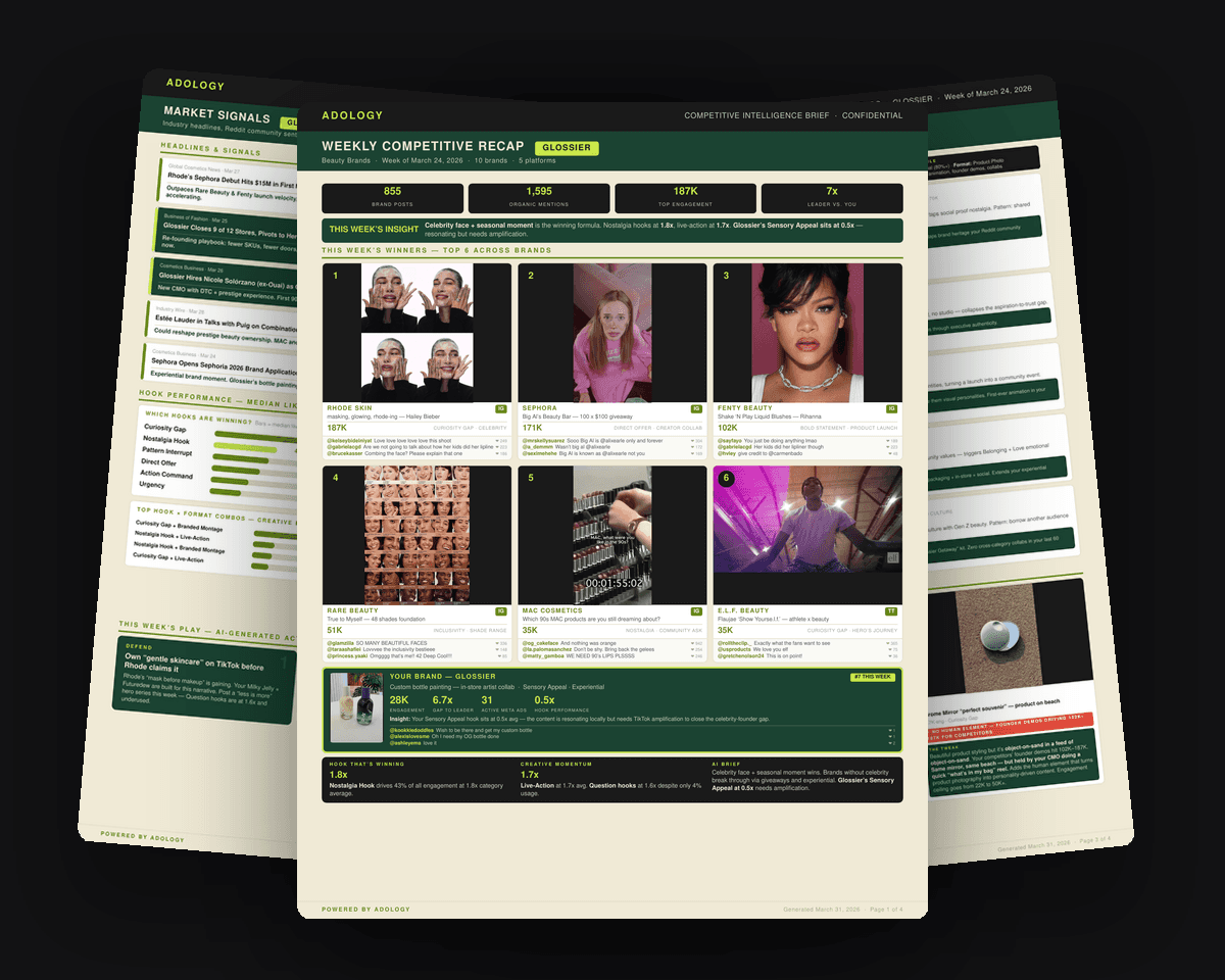 Point Adology at a set of brands and get a finished three-page brief: visual scoreboard of what ran last week, market signals, and social trend coaching. Refreshed every Monday.