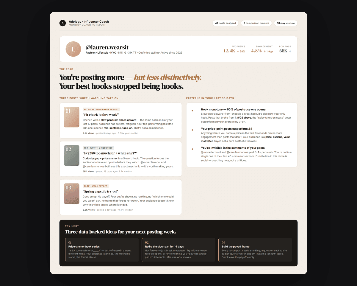 Pattern analysis on what's working in their content, post-level critique on what's not, and data-backed ideas for what to try next. The coaching relationship most brands promise and almost none deliver.