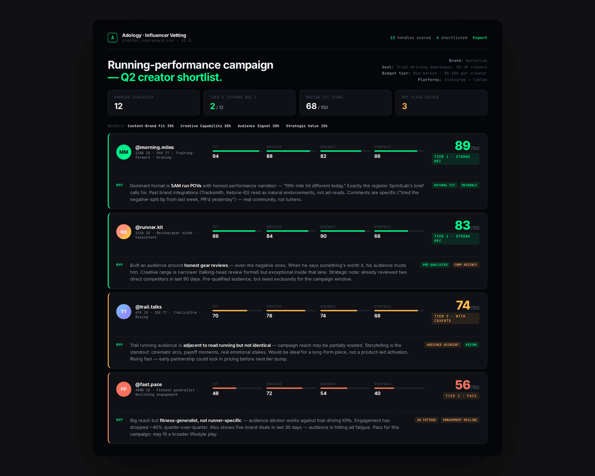 Drop in a list of handles. Get back an evidence-scored shortlist — audience fit, content fit, brand safety — plus a personalized brief for every top pick. Stop paying for vibes.